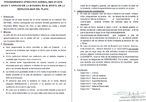 Con una marcada impronta autoritaria, Mourglier puso en circulación en los últimos días el denominado “Procedimiento Operativo Normal Número 01-2016”, con el cual procedió a fijar detalladamente las tareas que deben efectuar los empleados para el “Izado y Arriado de la Bandera en el Mástil de la Estación Mar del Plata”.