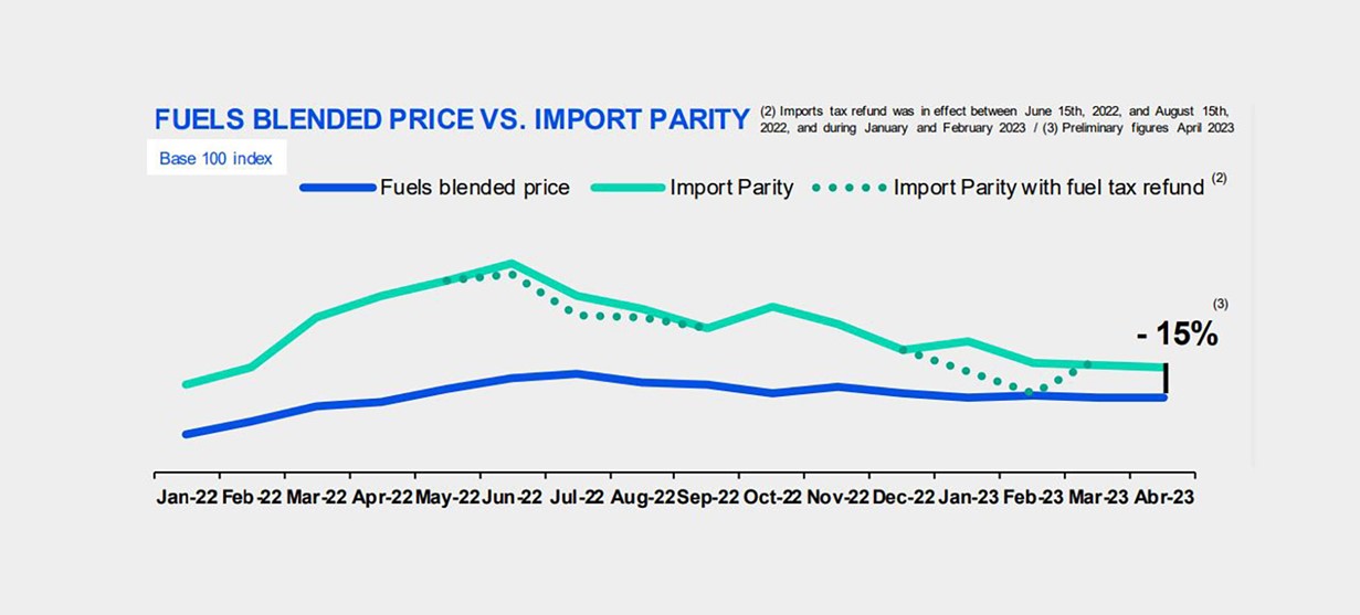 En diálogo con analistas internacionales, Alejandro Lew, el CFO de la compañía, explicó que, en términos de precios, durante el primer cuarto del año continuaron con su estrategia de ajustar los valores de los combustibles locales de manera mitigar, en la mayor medida posible, el efecto de la depreciación de la moneda. “Así se reduce, o se evita agrandar, la brecha entre la cotización de los combustibles locales frente a las paridades internacionales”, señaló.