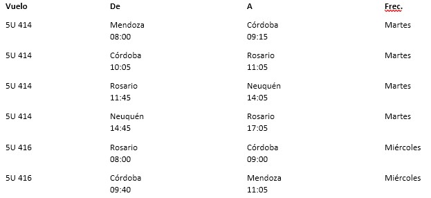 La aerolínea de fomento de la Fuerza Aérea Argentina tendrá servicios cada 15 días. El tramo Mendoza – Córdoba – Rosario – Neuquén – Rosario será operado los martes, y Rosario – Córdoba – Mendoza los miércoles.