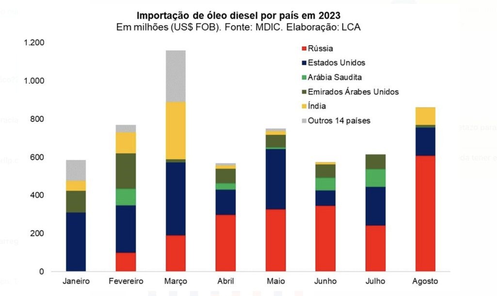 En lo que va del 2023 el 35,8% de las importaciones de gasoil en Brasil provinieron de Rusia. Comenzaron en febrero y fueron escalando hasta alcanzar el 70% de las importaciones de agosto. Rusia ya había superado en abril a Estados Unidos como el principal origen del gasoil importado en el país vecino.