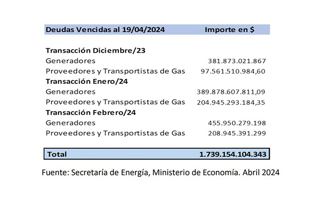 Esta deuda se genera porque como los usuarios no cubren con sus tarifas la energía que consumen, el Estado paga a las generadoras la diferencia a través de Cammesa. La Secretaría de Energía había informado que el stock de deuda era de $1,74 billones contando públicos y privados, casi USD 2.000 millones, teniendo en cuenta los vencimientos de diciembre, enero y febrero. Para cobrar febrero en efectivo, las empresas deben aceptar el bono por los dos meses anteriores.
