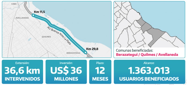 Además, se avanzará con la repavimentación, bacheo y demarcación del tramo en sentido a La Plata desde el peaje Hudson hasta La Plata. Son 22 kilómetros y tendrá una inversión de 16 millones de dólares.