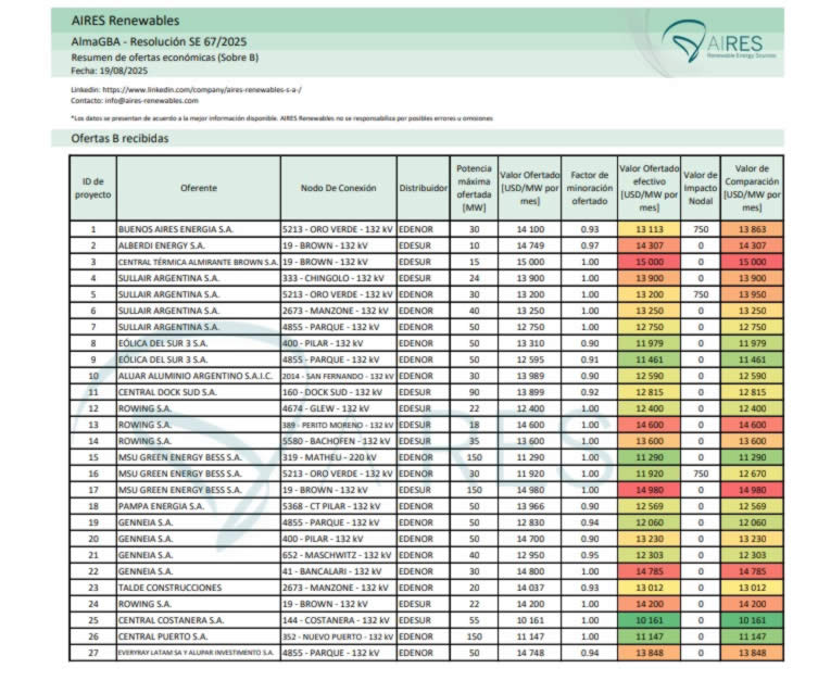 Según un informe elaborado por la consultora Aires Renewables, que dirige Diego Werner, Central Puerto presentó las ofertas más competivas con dos proyectos; uno por 150 megawatts (MW), con un valor ofertado de 10.161 (US$/MW por mes); y otro por 55 MW en cabeza de Central Costanera —también controlada por Central Puerto—, por 11.147 dólares. Más atrás se ubicaron MSU Green Energy, que presentó una propuesta económica por 11.290 (US$/MW por mes) por un proyecto de 150 MW; y Eólica del Sur, con 11.461 dólares. La intención del gobierno es oficializar a los ganadores del proceso licitatorio el próximo 5 de septiembre.