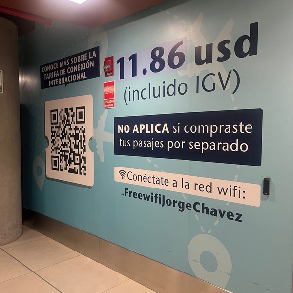 Dentro del Aeropuerto Internacional Jorge Chávez, los carteles informan en español y en inglés: “¿Haces escala en Lima? Paga la tarifa de conexión internacional. Evita las colas pagando online con este QR”. El mensaje aclara el monto a pagar, 11,86 dólares y suma una frase que genera confusión: “No aplica si compraste tus pasajes por separado”.