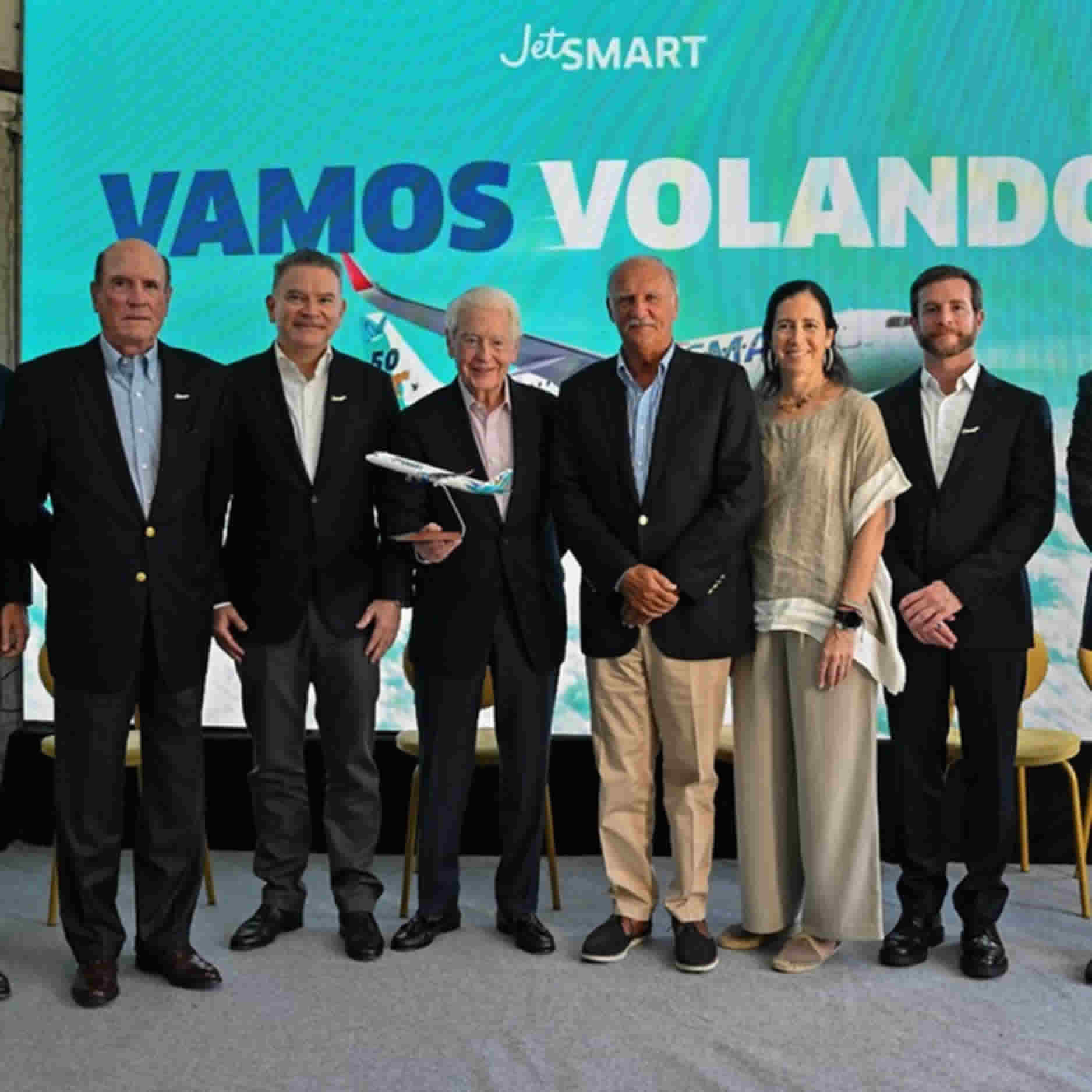 Bill Franke (sosteniendo el avión), fundador del fondo Indigo Partners que controla JetSmart. A su izquierda el CEO Estuardo Ortiz.